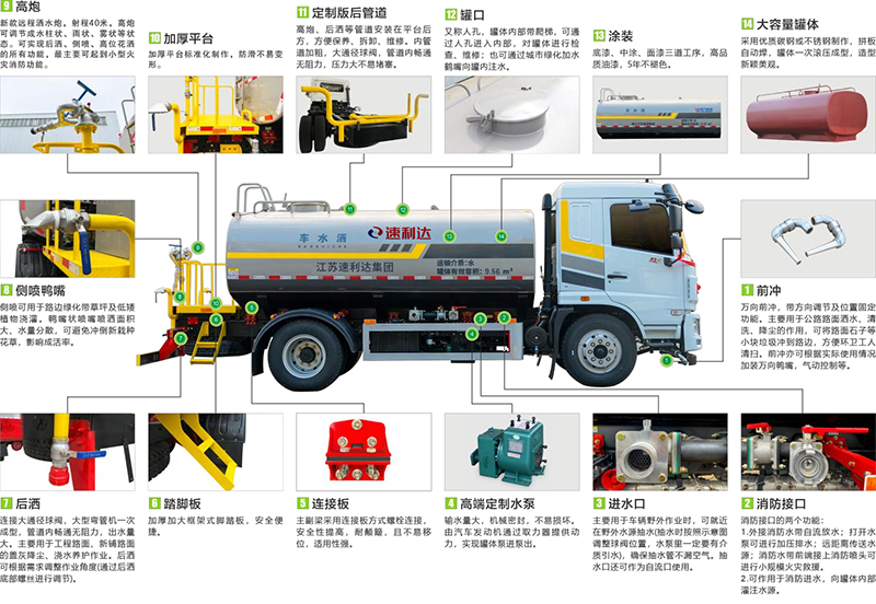 ● 采用專用定制版大功率水泵,具有性能優(yōu)良、工作可靠、效率高、流量大、等特點(diǎn),前沖可達(dá)雙向8車道,后灑可達(dá)雙向4車道,高炮最大可達(dá)40米射程。